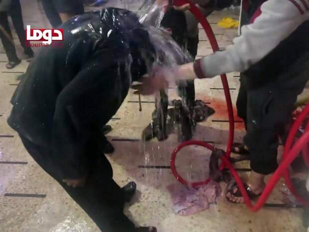 Изображение с видео, предоставленного "Координационным комитетом города Дума", показывает неизвестных добровольцев, поливающих мужчину водой во временном госпитале, после предполагаемой химической атаки