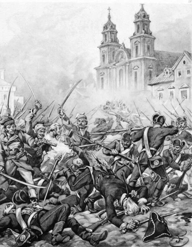 Немного о событиях, предшествовавших разгрому польского восстания. После французской революции 1789 года в Речи Посполитой появились сторонники реформ в интересах буржуазии. Между ними и консерваторами возник конфликт, близкий к гражданской войне. Как это часто происходит в подобных ситуациях, одна из сторон конфликта (консерваторы) обратилась за помощью в разрешении внутреннего спора к внешним силам: Россия и Пруссия согласились помочь. В 1792 году вслед за военными отрядами польских консерваторов в Польшу вошли русские и прусские войска. 23 сентября 1793 года Польский сейм утвердил 2-й раздел Польши. В состав России вошли земли «издревле России принадлежащие» с православным населением: Минская, Киевская, Винницкая и Черкасская области, Пруссия получила Данциг. Численность Коронных войск Польши сокращалась до 15 тысяч человек, а российские войска были расквартированы в Варшаве и ряде городов для поддержания мира.