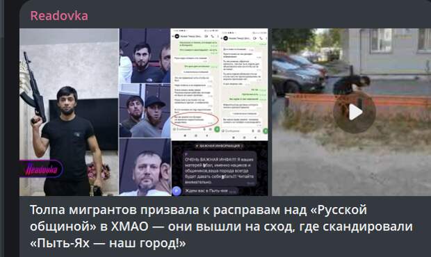В городе Пыть-Ях, расположенном в ХМАО толпа мигрантов публично призывала к расправам над членами "Русской общины" (РО). Мигранты провели митинг, где звучали лозунги "Пыть-Ях - наш город!", сообщает Telegram-канал Readovka.